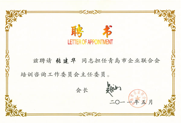 張董事長(zhǎng)被聘為青島市企業(yè)聯(lián)合會(huì)培訓(xùn)工作委員會(huì)主任委員