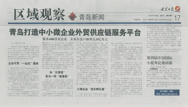 ? 青島打造中小微企業(yè)外貿(mào)供應(yīng)鏈服務(wù)平臺(tái)【大眾日報(bào)】 - 媒體報(bào)道 - :: HIKING GROUP 新華錦首頁(國際貿(mào)易)(金融投資)(老年頤養(yǎng)) ::