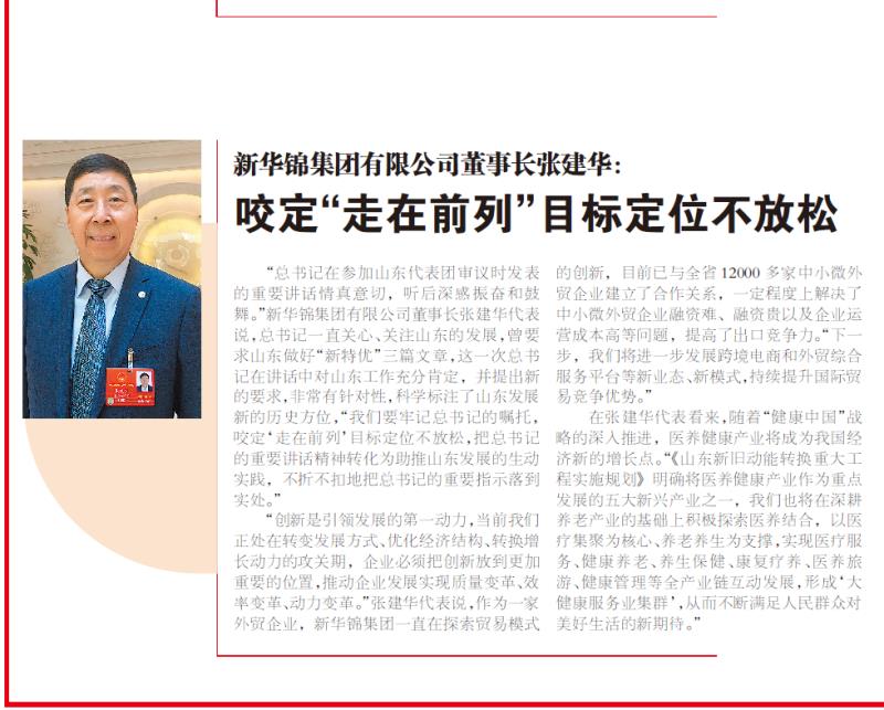 “總書記在參加山東代表團審議時發(fā)表的重要講話情真意切,聽后深感振奮和鼓舞。”新華錦集團有限公司董事長張建華代表說,總書記一直關心、關注山東的發(fā)展,曾要求山東做好“新特優(yōu)”三篇文章,這一次總書記在講話中對山東工作充分肯定,并提出新的要求,非常有針對性,科學標注了山東發(fā)展新的歷史方位,“我們要牢記總書記的囑托,咬定‘走在前列’目標定位不放松,把總書記的重要講話精神轉化為助推山東發(fā)展的生動實踐,不折不扣地把總書記的重要指示落到實處。”