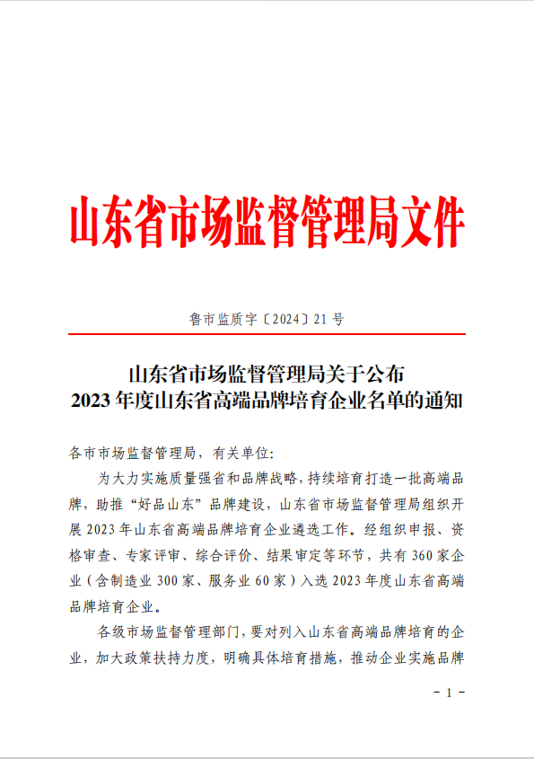 為大力實(shí)施質(zhì)量強(qiáng)省和品牌戰(zhàn)略,持續(xù)培育打造一批高端品牌,助推“好品山東”品牌建設(shè),山東省市場(chǎng)監(jiān)督管理局組織開(kāi)展2023年山東省高端品牌培育企業(yè)遴選工作。經(jīng)組織申報(bào)、資格審查、專家評(píng)審、綜合評(píng)價(jià)、結(jié)果審定等環(huán)節(jié),共有360家企業(yè)(含制造業(yè)300家、服務(wù)業(yè)60家)入選2023年度山東省高端品牌培育企業(yè)。