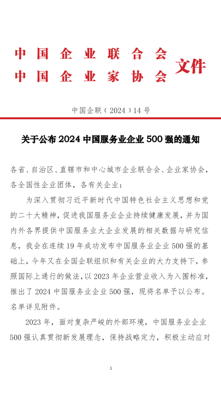 “中國服務(wù)業(yè)企業(yè)500強(qiáng)榜單”由中國企業(yè)聯(lián)合會、中國企業(yè)家協(xié)會聯(lián)合發(fā)布。榜單以企業(yè)營業(yè)收入為入圍標(biāo)準(zhǔn),全面、系統(tǒng)、真實(shí)地反映全國服務(wù)業(yè)企業(yè)發(fā)展的現(xiàn)狀和未來的發(fā)展趨勢,已連續(xù)發(fā)布20年,是衡量服務(wù)業(yè)企業(yè)地位的權(quán)威榜單。