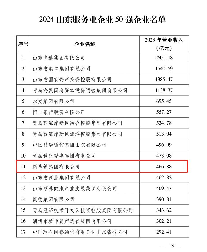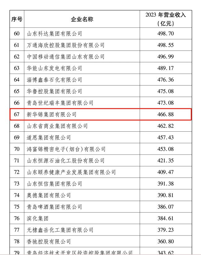新華錦集團(tuán)榮列2024山東企業(yè)100強(qiáng)榜單第67位