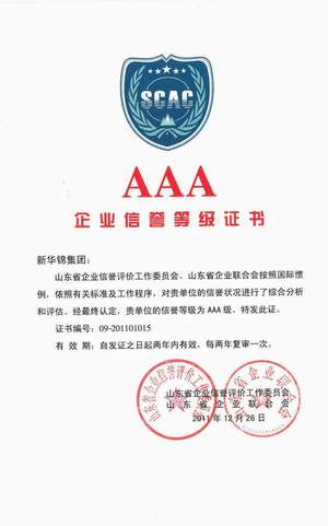 新華錦堅(jiān)持“善心善行,利他利己”的處事方針,倡導(dǎo)價(jià)值鏈和諧共贏的經(jīng)營(yíng)理念。集團(tuán)嚴(yán)格遵守法律法規(guī)和社會(huì)公德、商業(yè)道德以及行業(yè)規(guī)則,以“依法經(jīng)營(yíng),誠(chéng)信經(jīng)營(yíng)”為原則,擁有良好的信貸信用、納稅信用和合同履約信用,成為工商銀行、建設(shè)銀行、交通銀行、中信銀行等金融機(jī)構(gòu)的戰(zhàn)略合作伙伴,還被山東省企業(yè)信譽(yù)評(píng)價(jià)工作委員會(huì)、山東省企業(yè)聯(lián)合會(huì)評(píng)為“山東省AAA級(jí)優(yōu)等信譽(yù)企業(yè)”。