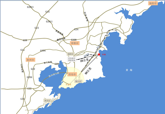 項(xiàng)目距離青島市中心城區(qū)約30公里, 距離流亭國(guó)際機(jī)場(chǎng)25公里。濱海大道和王沙路兩條主干道在項(xiàng)目?jī)?nèi)交匯,正在建設(shè)中的兩條輕軌線路,即連接市區(qū)的R1線和連接機(jī)場(chǎng)的R6線路亦在項(xiàng)目交匯。通過(guò)城際鐵路串聯(lián),成為煙臺(tái)、威海、青島、濰坊等地區(qū)“一小時(shí)經(jīng)濟(jì)圈”的中心樞紐。